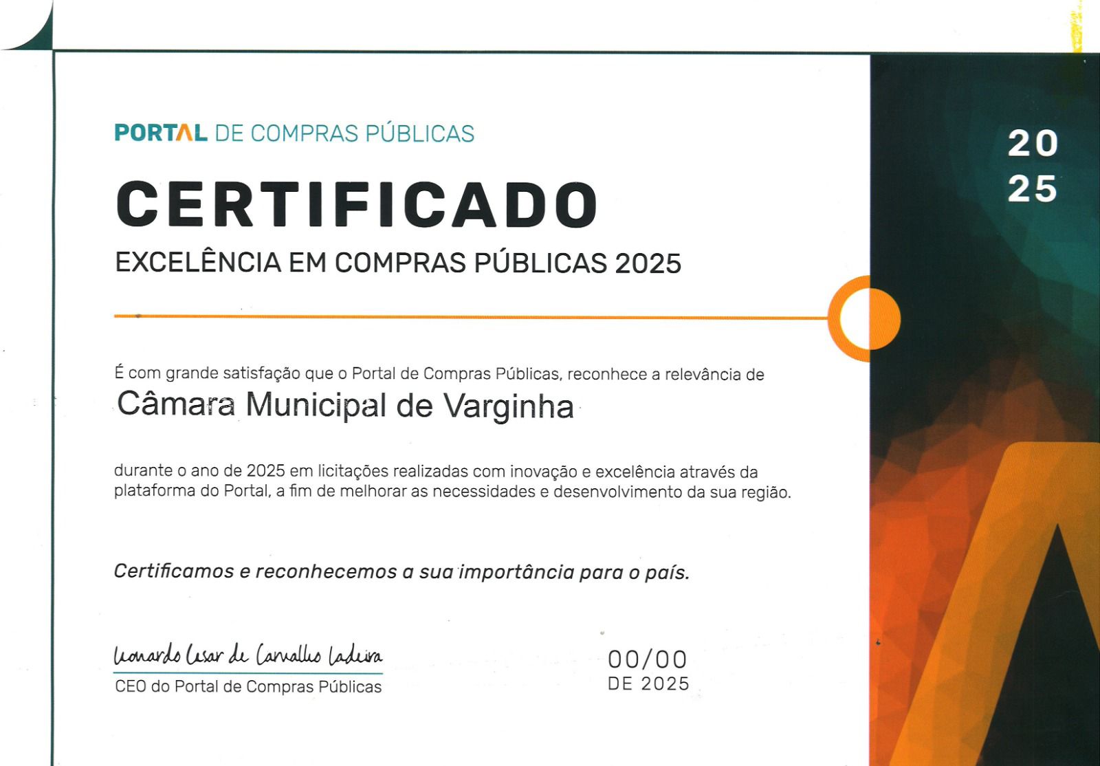 A Câmara Municipal de Varginha foi agraciada com o Certificado de Excelência em Compras Públicas 2025, concedido pelo Portal de Compras Públicas, em reconhecimento às boas práticas adotadas na condução dos processos licitatórios e à gestão responsável e eficiente dos recursos públicos.
