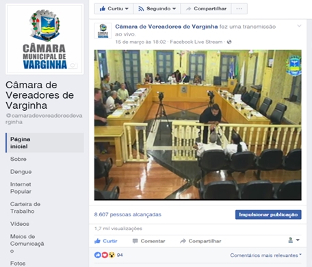 Na última quarta-feira (15) foi realizada a primeira transmissão ao vivo da Sessão Ordinária pelo Facebook e a recepção da população foi excelente. Até agora, o vídeo já teve mais de 1,7 mil visualizações e mais de 8,6 mil pessoas foram alcançadas.