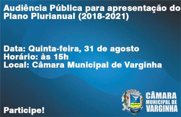 A Câmara Municipal de Varginha convida a população para participar de uma audiência pública, que tem como objetivo apresentar as propostas para o Plano Plurianual do Município, para os anos de 2018 a 2021.